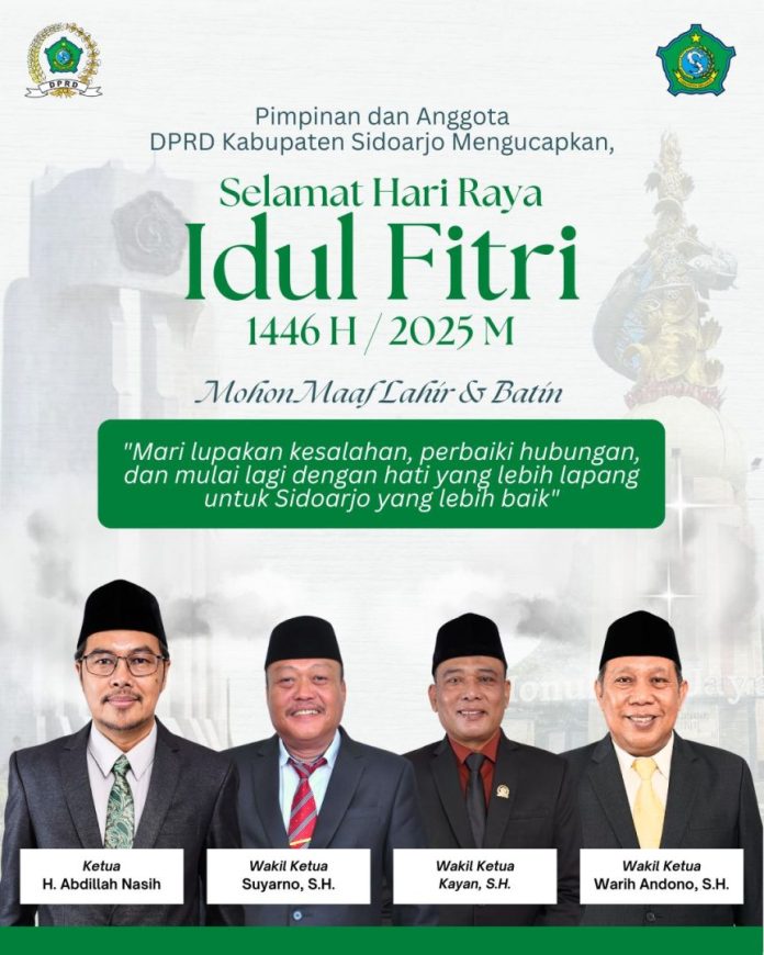 HomeAdvertorialUcapan Hari Raya Idul Fitri 1446 H / 2025 DPRD Kabupaten SidoarjoAdvertorialUcapan Hari Raya Idul Fitri 1446 H / 2025 DPRD Kabupaten Sidoarjo27 March 2025ShareFacebookTwitterPinterestWhatsAppEmailTelegram ShareFacebookTwitterPinterestWhatsAppEmailTelegram SebelumnyaBupati Subandi bersama Forkopimda Bagikan Ribuan Takjil untuk Masyarakat SidoarjoSelanjutnyaTadarus Jurnalistik, Wartawan Sidoarjo Bahas Ancaman Jurnalis di Era KiniBERITA LAINNYA AdvertorialBanner Ucapan HUT RI ke-80 DPRD Kabupaten Sidoarjo 14 August 2025 Advertorial630 PPPK Terima SK, DPRD Sidoarjo Minta Komitmen Profesional dan Berkinerja Baik 5 May 2025 Advertorial630 PPPK Terima SK, DPRD Sidoarjo Minta Komitmen Profesional dan Berkinerja Baik 3 May 2025 LEAVE A REPLY Cancel replyComment:Please enter your comment! Name:*Please enter your name here Email:*You have entered an incorrect email address!Please enter your email address here Website: Save my name, email, and website in this browser for the next time I comment. IKUTI9,204FansLike27,159FollowersFollow37,400FollowersFollow0SubscribersSubscribeBERITA POPULERKejar Pengurangan Titik Kemacetan, Pemkab Sidoarjo Matangkan Tahap Awal Flyover Gedangan 19 February 2026Aksi Lempar Paket Sabu dan Ponsel ke Lapas Digagalkan, Dua Pelaku... 19 February 2026Hilal Tak Teramati di 21 Titik, Awal Ramadan 1447 H Tunggu... 17 February 2026Imlek 2577 Kongzili, Napi Asal Malaysia di Lapas Porong Dapat Potongan... 17 February 2026Pengendara Motor Tewas Terlindas Trailer di Raya Trosobo 17 February 2026Load moreKATEGORI POPULERPemerintahan673Peristiwa656Politik331Hukum & Kriminalitas197Olahraga143Pilkada Sidoarjo 2024107